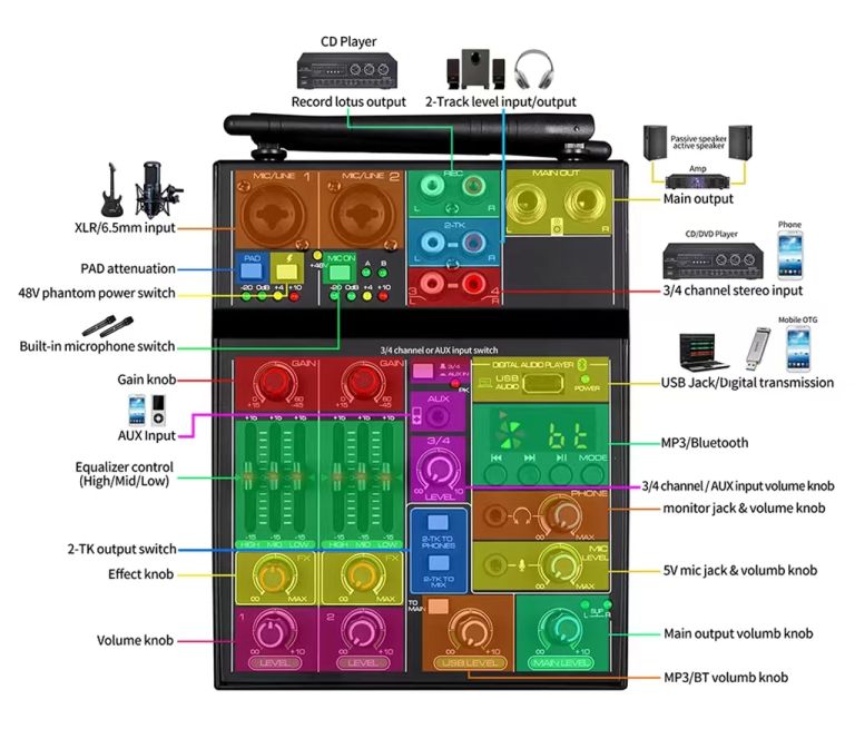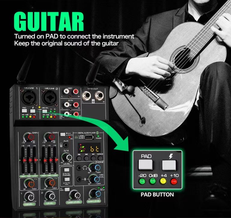 Set bežičnih mikrofona u kompletu sa miksetom.Mogućnost povezivanja dodatnih istrumenata.Mikseta ima integrisani bluetooth pomoću koga se može povezati telefon i reprodukovati muzika.Idealno za karaoke, live nastupe, ustanove, škole....