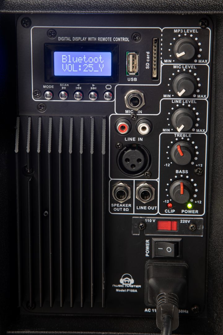 Aktivna zvucna kutija Music master F100A snage 200w.Bas zvucnik 10" i titanijumski drajver.Integrisani Bluetooth, FM tuner sa memorijom 15 stanica,MP3 playerom i ulazom za SD karticu i Flash memoriju.Zvučna kutija ima izlaz za još jednu pasivnu kutiju koju pokreče pojačalo iz ove kutije.