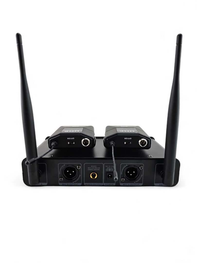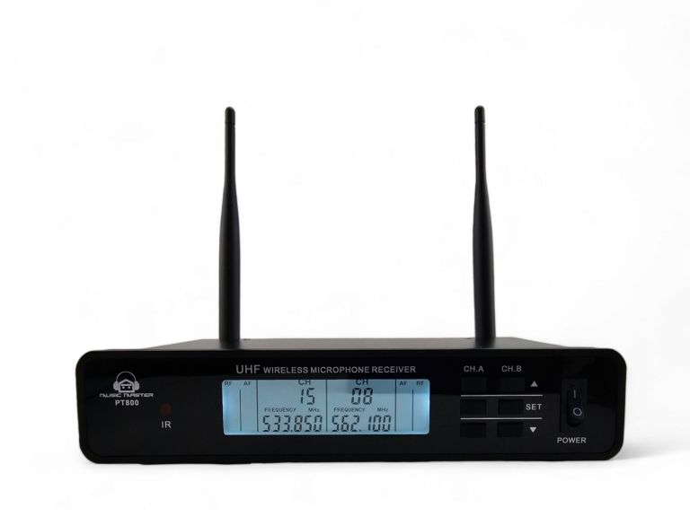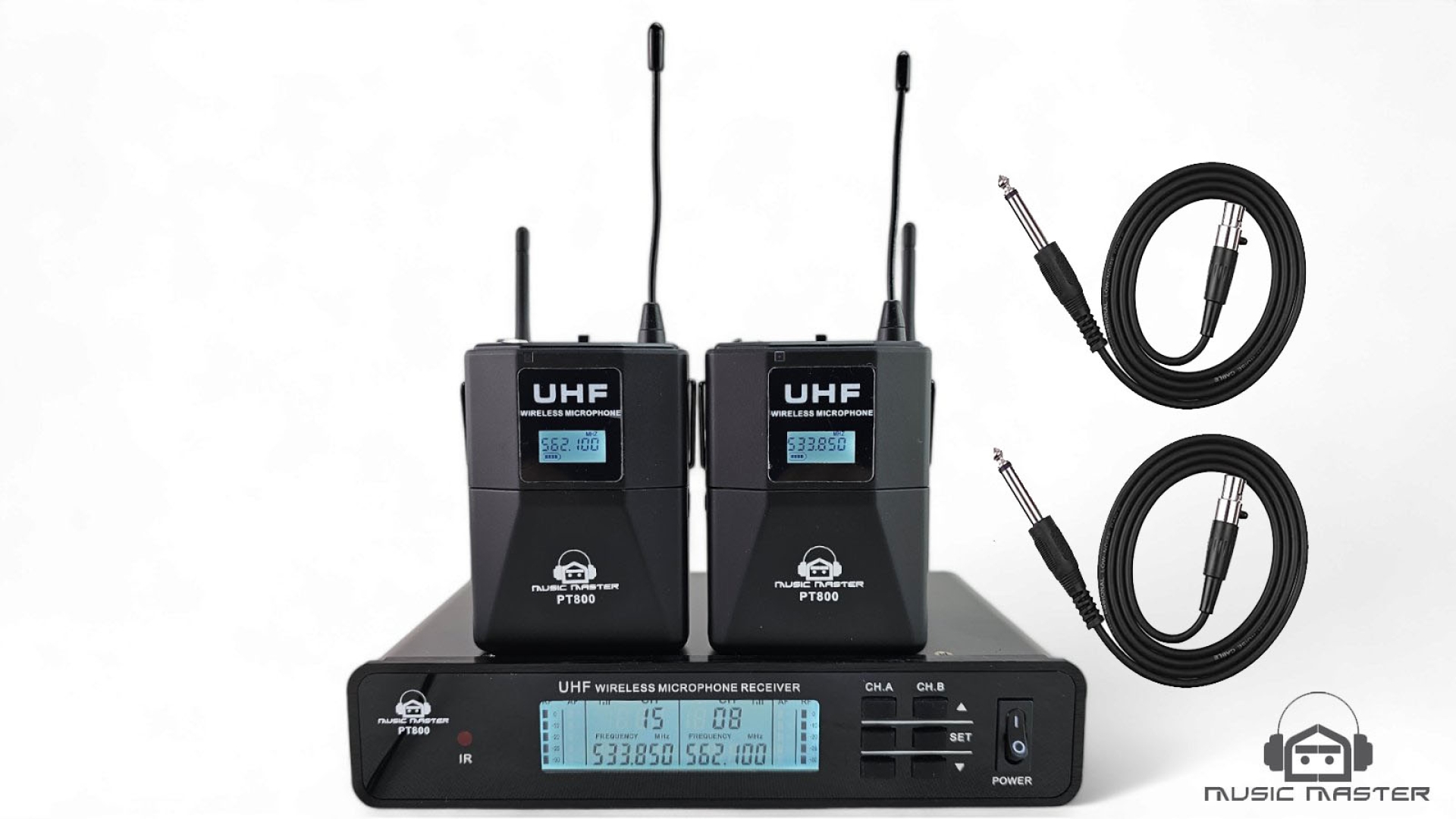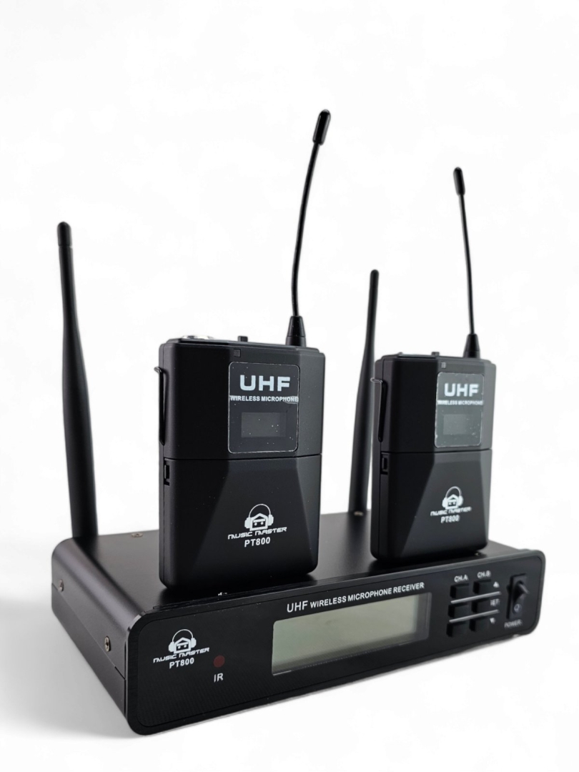 Music master PT800 je bežični dupli instrumentalni sistem koji radi kao dva odvojena nezavisna sistema.Sistem je sa promenljivim frekfencijama i ima 200 kanala i radi na frekfenciji u opsegu od 500MHz-600 Mhz.Koristi 2 baterije od 1,5V.