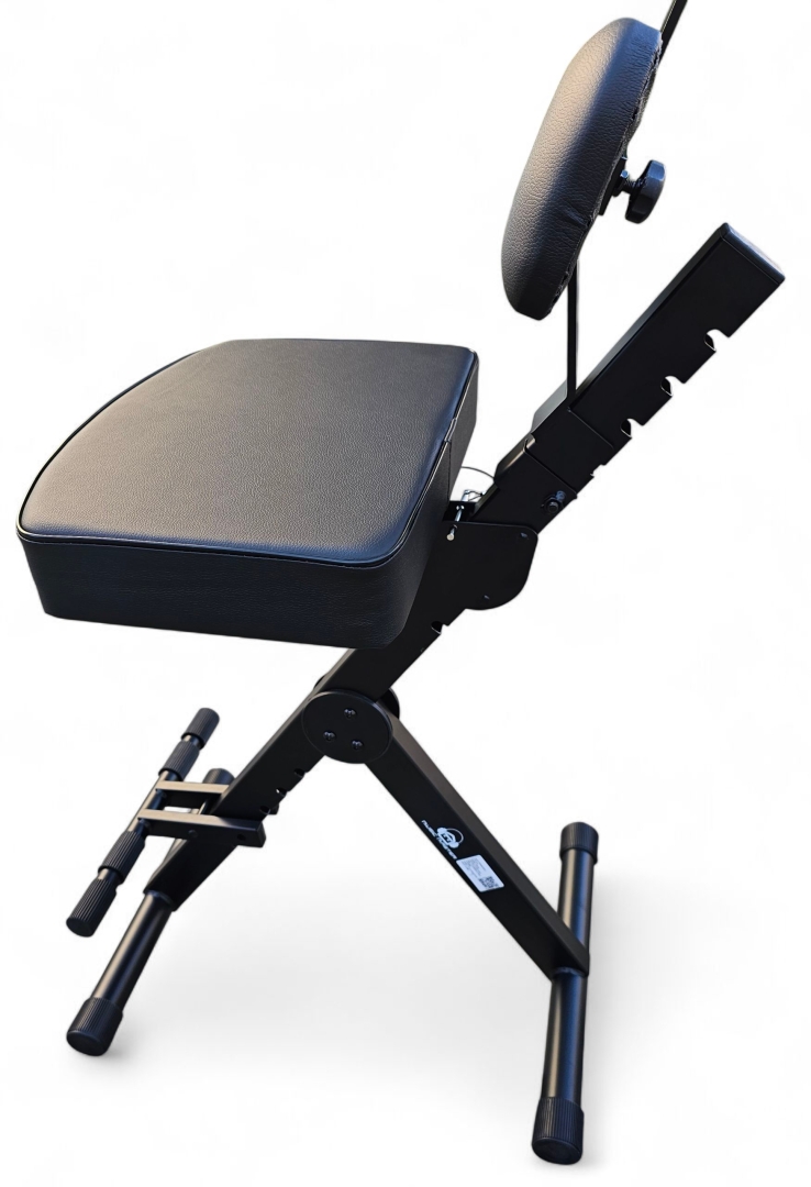 Profesionalna stolica za muzicare, podesavanje visine sedista, visine naslona za noge kao i podesavanje naslona za ledja cini je veoma udobnom.Stolica je marke Music master i nosivost stolice je 140Kg.
