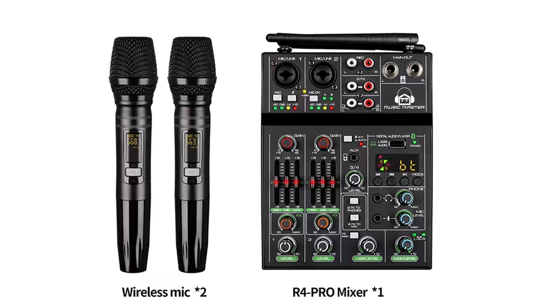Set bežičnih mikrofona u kompletu sa miksetom.Mogućnost povezivanja dodatnih istrumenata.Mikseta ima integrisani bluetooth pomoću koga se može povezati telefon i reprodukovati muzika.Idealno za karaoke, live nastupe, ustanove, škole....
