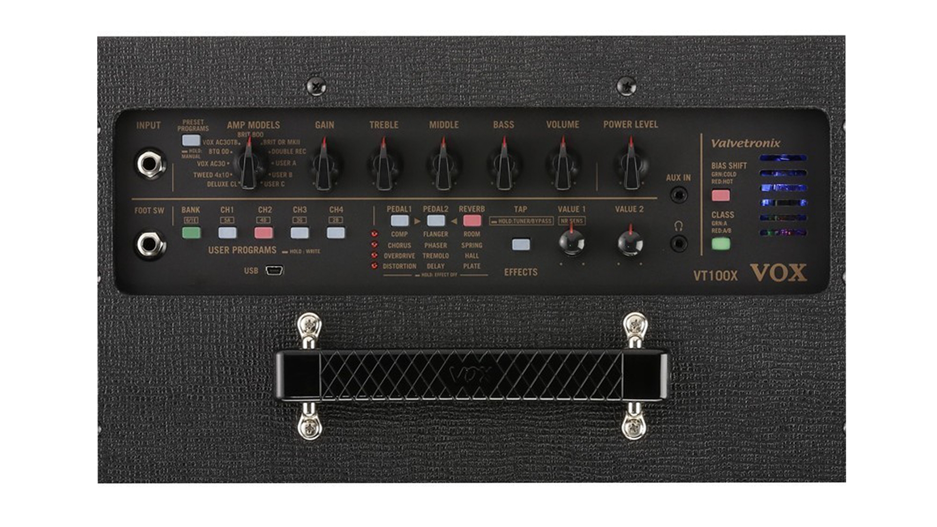 VT20X Power Amplifier Output: VT20X: Maximum approx. 20W RMS @5 ohms Amp Models: 11/20 (when using Tone Room - Editor/Librarian software) DELUXE CLã€TWEED 4x10ã€VOX AC30ã€BOUTIQUE ODã€VOX AC30TBã€BRIT 800ã€BRIT OR MKIIã€DOUBLE RECã€BOUTIQUE CLã€BRIT 1959ã€BOUTIQUE METAL Effects: Pedal 1 type: 4 (COMP, CHORUS, OVERDRIVE, DISTORTION) Pedal 2 type: 4 (FLANGER, PHASER, TREMOLO, DELAY) Reverb type: 4 (ROOM, SPRING, HALL, PLATE) Noise Reduction: 1 Programs: 33/60 (when using Tone Room - Editor/Librarian software) User Programs: 8 (2 banks x 4 channels) Speaker: VT20X: 8" 5 ohms Inputs / Outputs INPUT jack, AUX IN jack, Headphone jack, FOOT SW jack, USB (Type B) mini port Signal Processing A/D conversion: 24-bit D/A conversion: 24-bit Power Supply VT20X: AC adapter (DC 12 V) Current Consumption VT20X: 2.50 A Dimensions (W x D x H): VT20X: 410 x 225 x 347 / 16.14" x 8.86" x 13.66" Weight VT20X: 7.3 kg / 16.09 lbs. Included Items VT20X: AC adapter Accessories (sold separately): VOX VFS2 footswitch, VOX VFS5 footswitch
